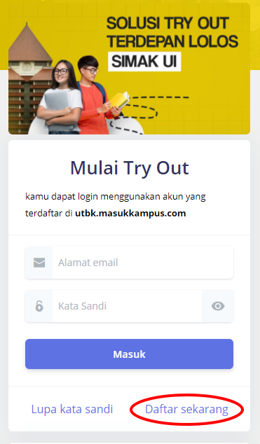 Pilih “daftar sekarang” untuk mendaftarkan diri kamu sebagai peserta TO online Simak UI Masuk Kampus