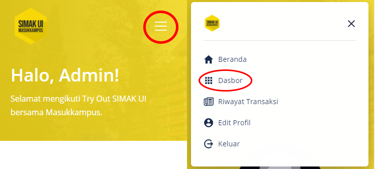 Klik menu (icon 3 garis di kanan atas), dan pilih menu “Dasbor”