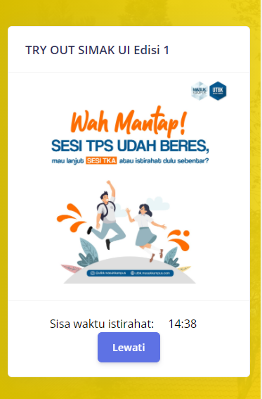 Pada perpindahan sesi TPS dan TKA ada jeda waktu istirahat 15 menit atau bisa kamu lewati